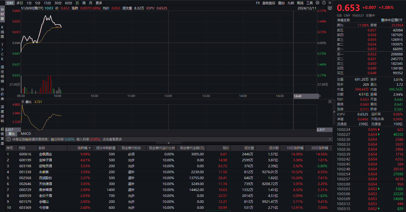 收尾发稿,酒ETF(512690)换手率3.01%,成交额4.51亿元,溢折率0.08%。